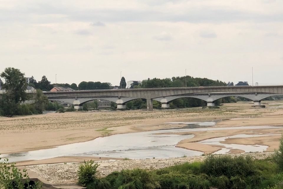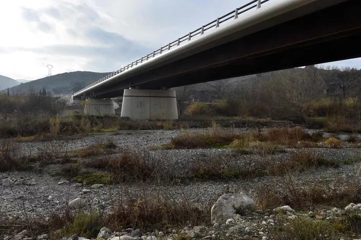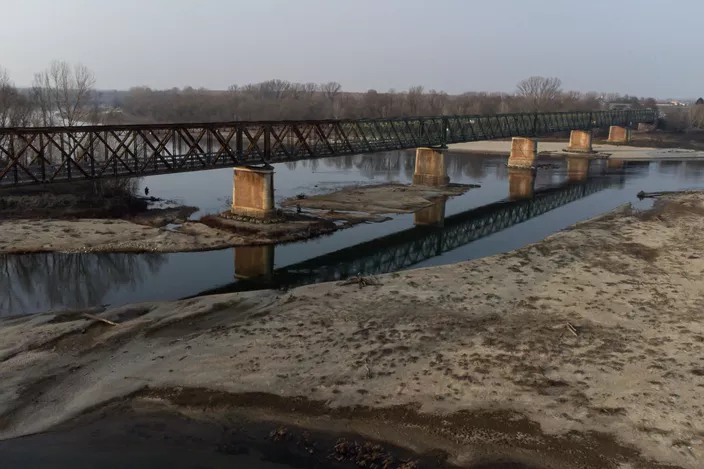 Sur cette photo prise le 23 février 2023, il est possible de voir le faible niveau d'eau du barrage de Vinca. Outre la représentation de cette sécheresse, le fleuve est également devenu le symbole de la bataille d'eau : cette semaine, le tribunal administratif a décidé de demander une réduction d'un quart du prélèvement des agriculteurs dans le fleuve, de peur de le voir disparaître