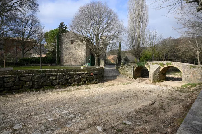 Dans le département des Pyrénées-Orientales, l'Agly est elle aussi complètement asséchée. Des mesures de restrictions d'usage ont été mises en place au mois de juin 2022 et resteront sûrement jusqu'à fin février. La période d'irrigation au mois de mai est menacée. Cette photo prise le 23 février 2023 montre le lit asséché de l'Agly, à la périphérie d'Estagel.