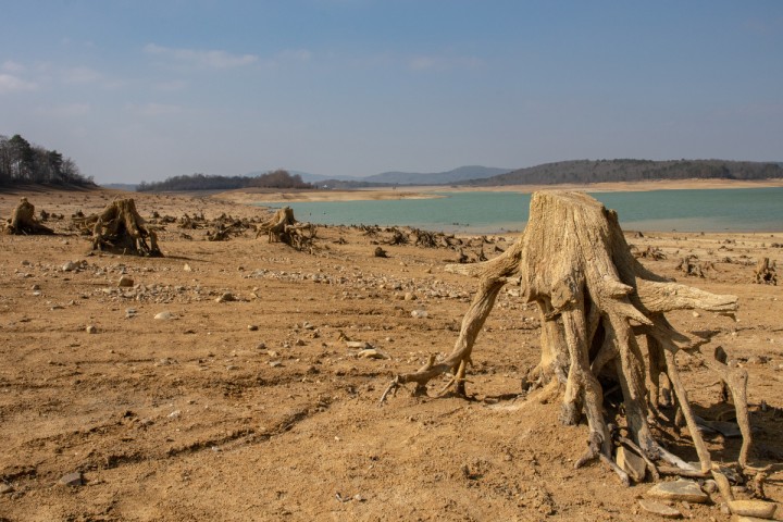 - Depuis le barrage de Montbel, le niveau de l’eau du lac est au plus bas. Il contient 13,8 millions de mètres cubes d’eau, alors qu’il est censé en contenir 35 millions à cette période de l’année. © Justin Carrette / Reporterre