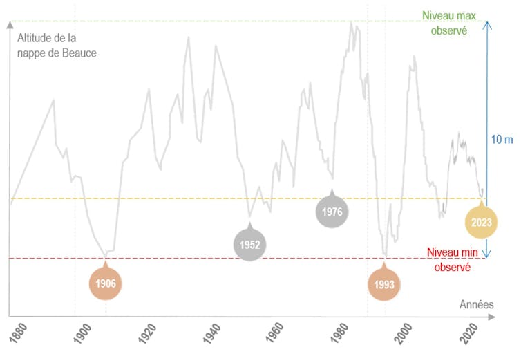 L’historique des mesures du réseau de piézomètres (les premières mesures du plus ancien, situé près de la sucrerie de Toury, remontent à 1875) a permis de reconstituer une chronique complète de l’évolution du niveau d’eau de 1875 à 2024. Celle-ci permet de voir que les variations annuelles de la nappe de Beauce correspondent aux infiltrations des pluies d’octobre à avril, et que ses variations interannuelles correspondent aux cycles climatiques.
