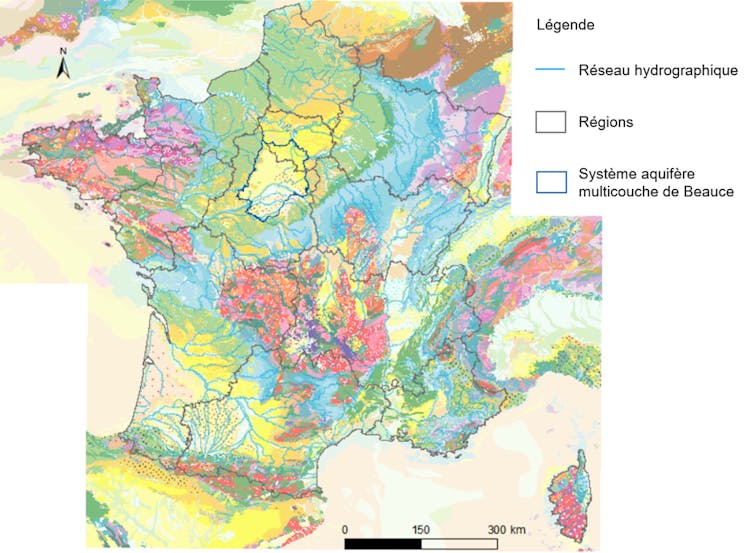 Etendue du système aquifère multicouche de Beauce sur fond de carte géologique au 1/1 000 000. BRGM, Fourni par l'auteur
