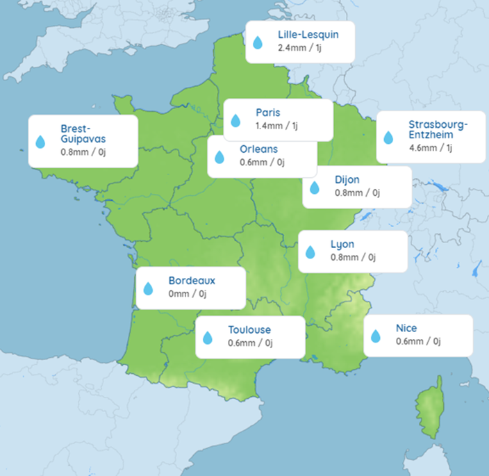 L'hiver passe mais il ne pleut toujours pas. Depuis le début du mois de février, la barre des cinq millimètres de précipitations en moyenne sur le territoire français n'a pas été franchie, selon La Chaîne météo*. Sur la première quinzaine de février, seuls 2,4 millimètres en moyenne ont été recensés. Plusieurs villes comme Bordeaux, Châteauroux, Toulouse et Melun n'ont pas été arrosées par la pluie depuis le 20 janvier dernier. «On a déjà dépassé le record de 1989 avec 22 jours sans pluie et on va franchir celui de mars 2020 pendant le confinement, avec 31 jours sans pluie», commente Cyrille Duchesne, météorologue pour La Chaîne Météo.