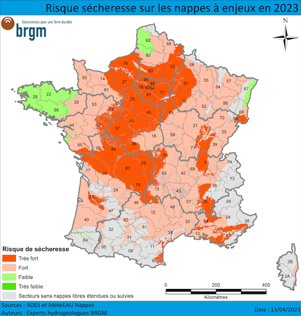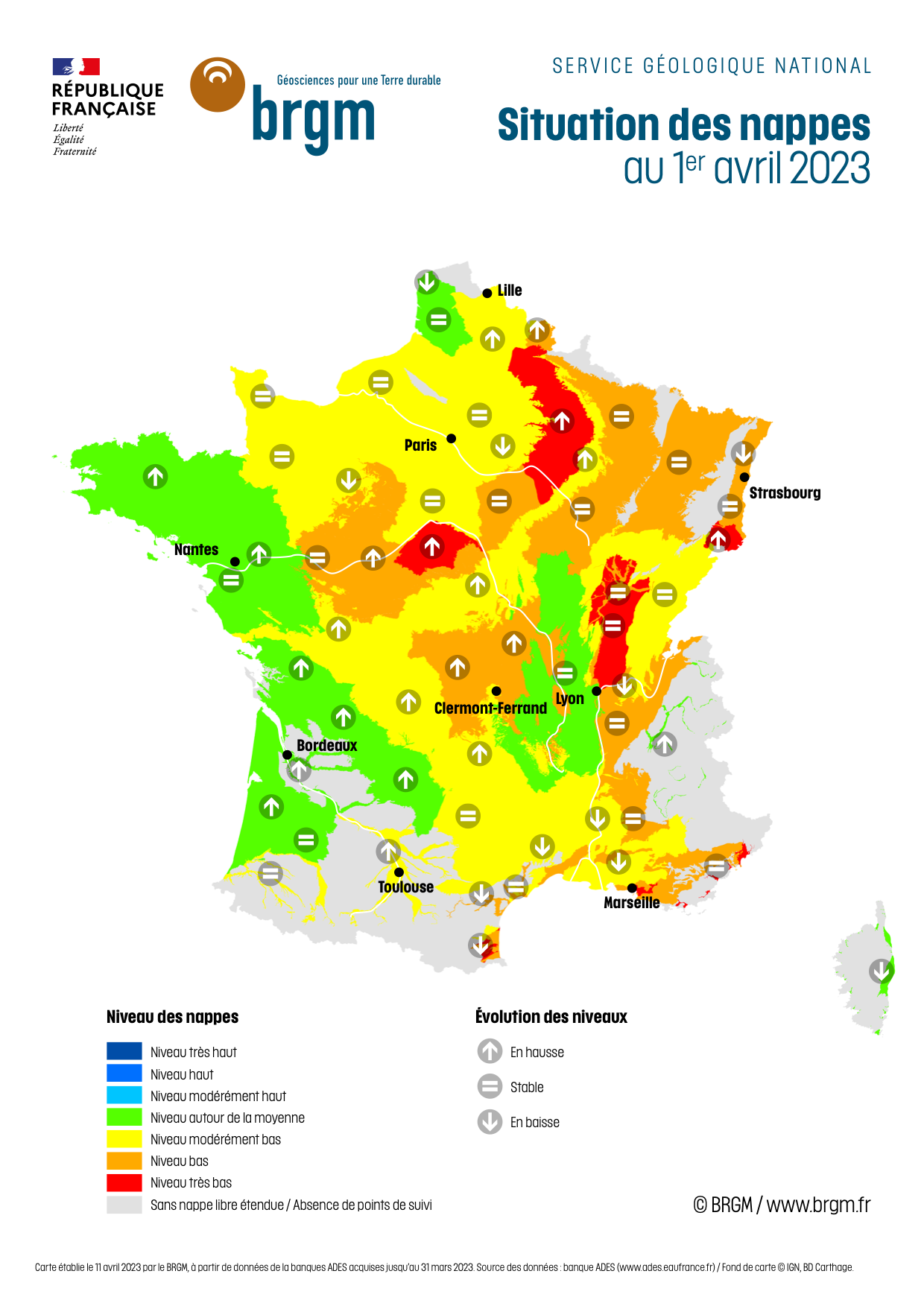 Nappes d'eau souterraine au 1er avril 2023 et risques de sécheresse estivale