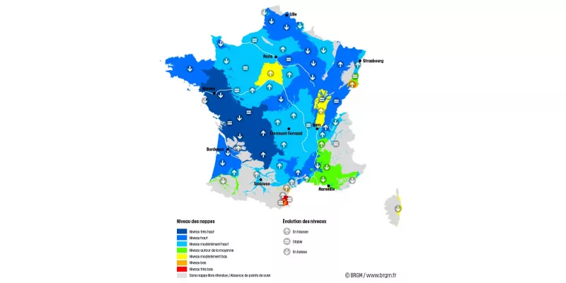 Du fait d’une recharge très excédentaire et perdurant jusqu’en mai, l’état des nappes phréatiques est très satisfaisant sur une grande partie du pays. 70% des niveaux sont au-dessus des normales.