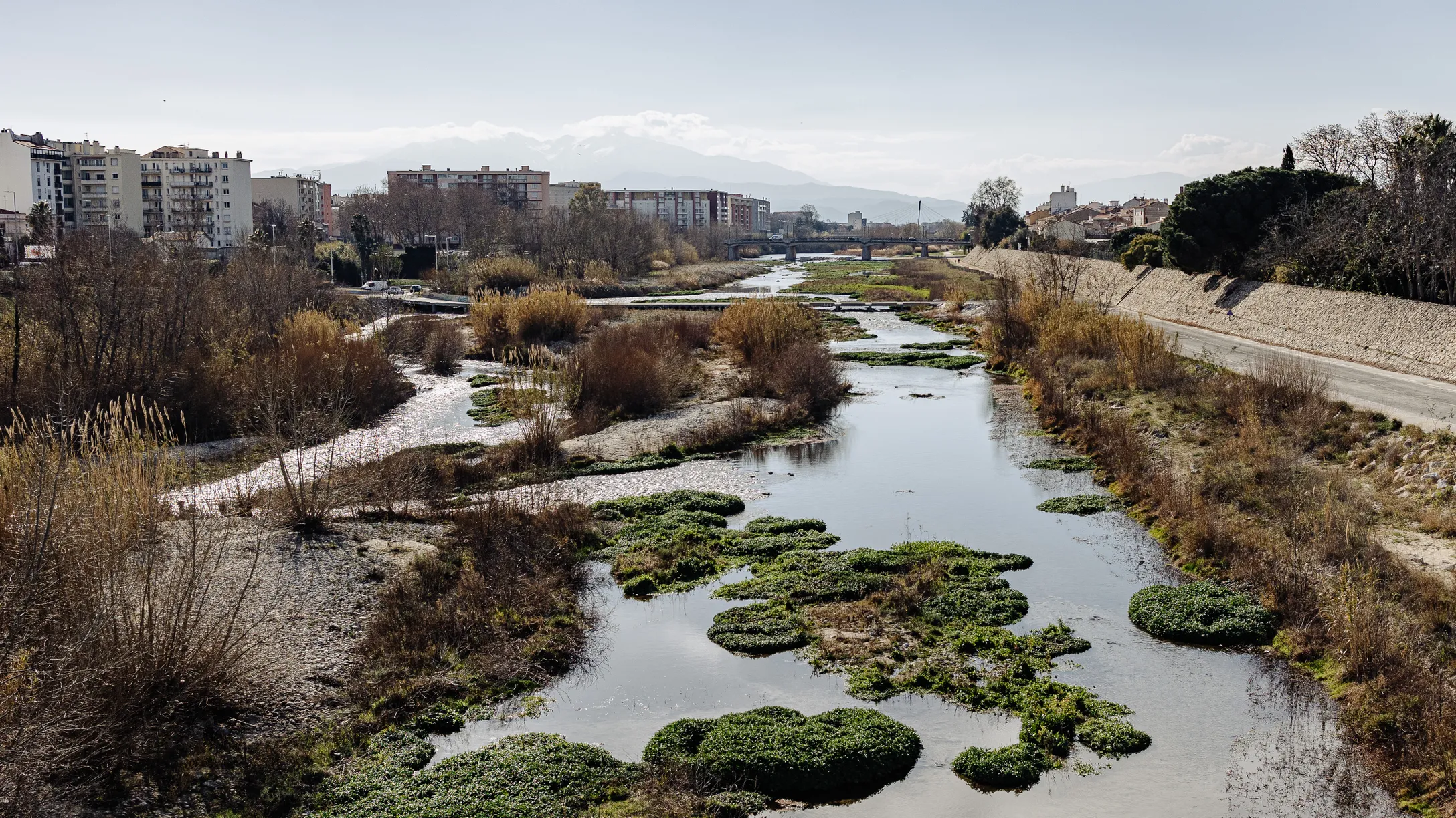 L'un des principaux fleuves du département, la Têt, à Perpignan, le 1er mars 2023. A quelques dizaines de kilomètres en aval, à Serdinya, son débit est d'1,5 m3 par seconde, contre 4,8 m3 par seconde en moyenne au mois de mars.