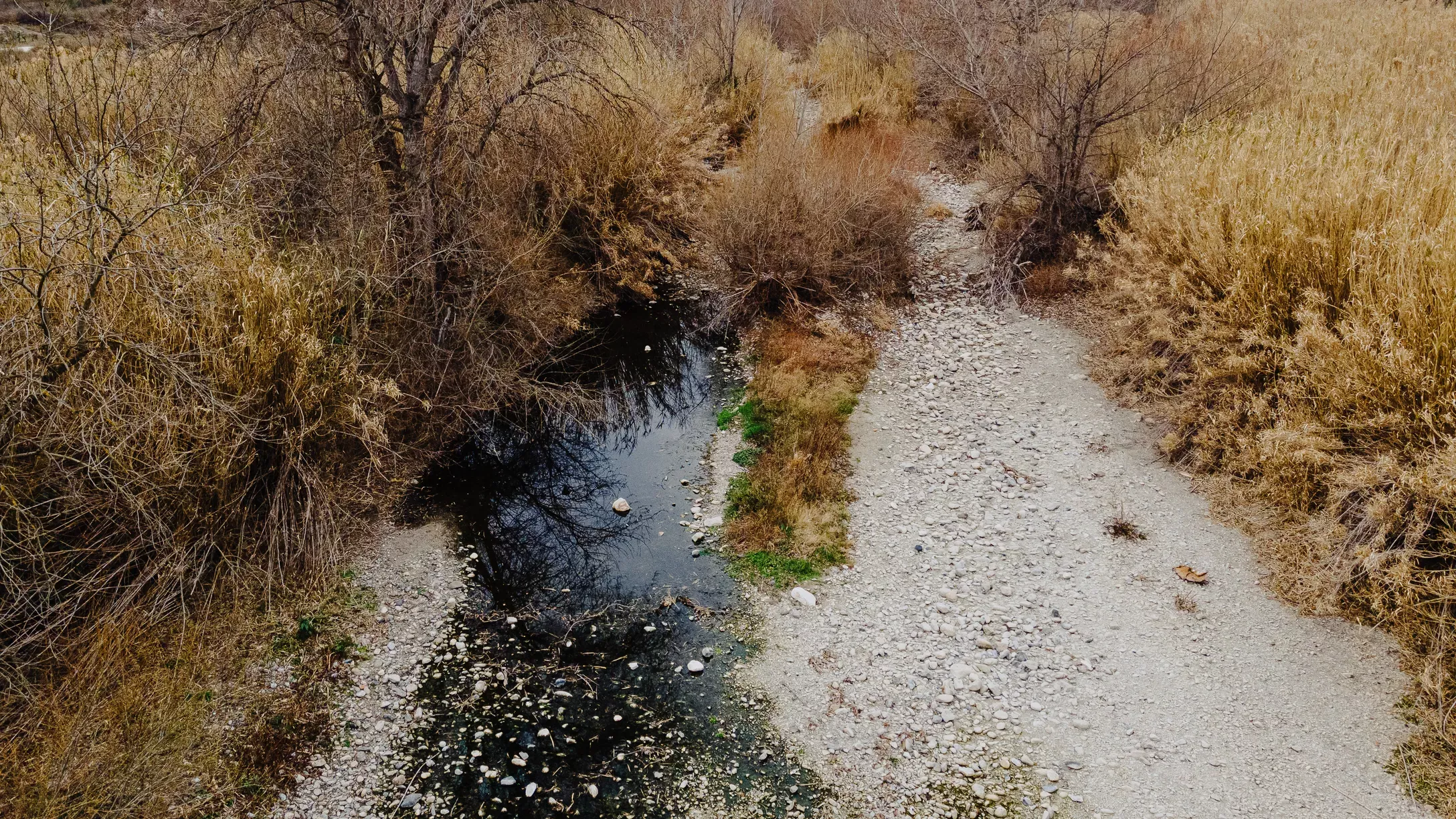 En aval du village d'Estagel (Pyrénées-Orientales), l'Agly s'arrête, le 28 février 2023. Contrairement à la situation habituelle, le fleuve côtier de 80 kilomètres ne rejoint plus la mer Méditerranée cet hiver, et se transforme en piège pour les poissons.