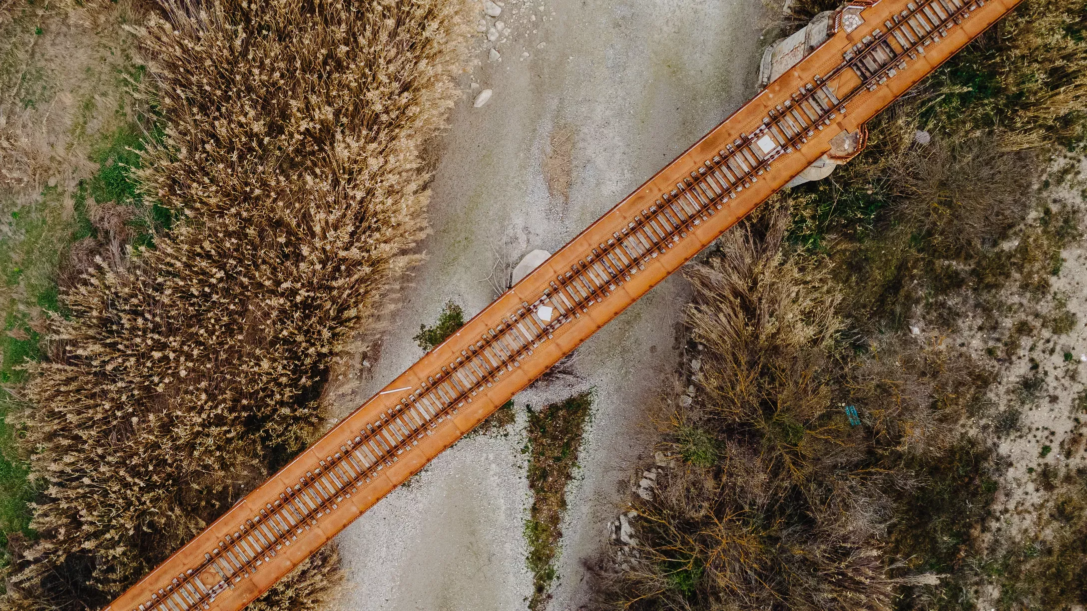 Un pont ferroviaire passe au-dessus du lit de l'Agly près d'Estagel, dans les Pyrénées-Orientales, le 28 février 2023. Ce fleuve côtier est habituellement à sec à la fin de l'été ou au début de l'automne, mais l'écoulement reprend normalement en hiver. Ce n'est pas le cas cette année.