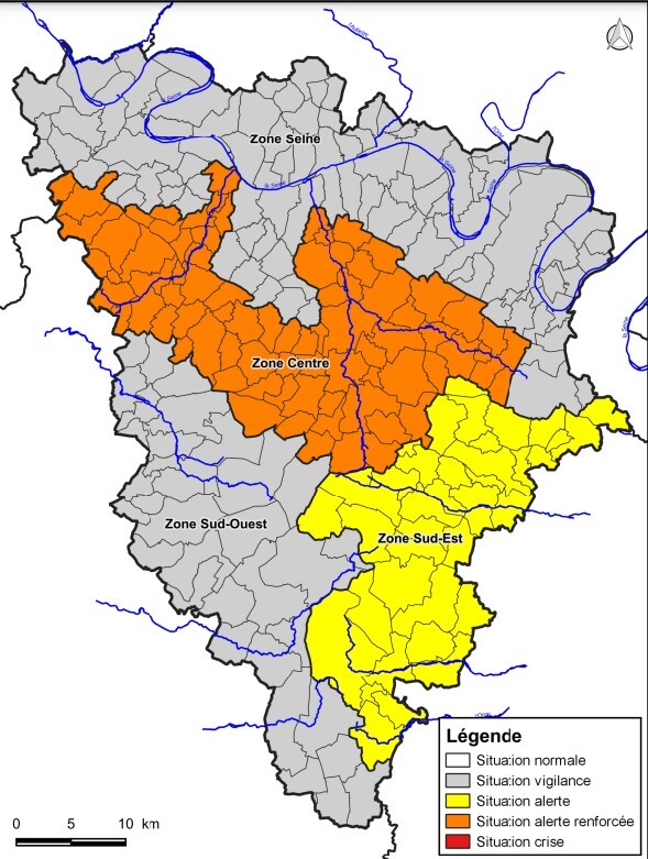 Sans surprise, la zone Centre des Yvelines, la plus touchée par le stress hydrique des nappes phréatiques, est maintenue en situation d’alerte renforcée. Les autres parties du département restent sous surveillance.