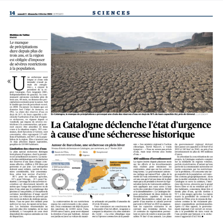 Le déficit actuel de précipitations en Catalogne est inédit depuis le début des relevés en 1916. Les niveaux des réservoirs, qui stockent l’eau de pluie pour une utilisation durant les mois plus secs, est tombé sous la barre des 16 %. Pour Pere Aragonès, président du gouvernement régional catalan, la région « souffre de sa pire sécheresse depuis un siècle ».