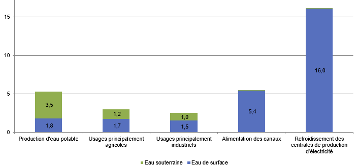 Plus de 80 % du volume d’eau douce prélevée est puisé dans les eaux de surface (rivières, lacs, canaux, retenues, etc.), compte tenu des quantités nécessaires au refroidissement des centrales électriques et à l’alimentation des canaux. En faisant abstraction de ces deux usages, les prélèvements d’eau douce mobilisent globalement autant les eaux souterraines que les eaux superficielles (graphique 2).