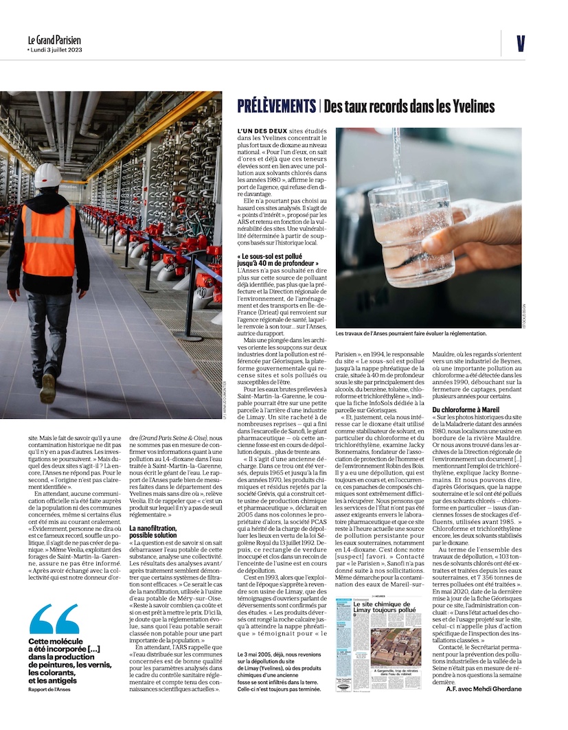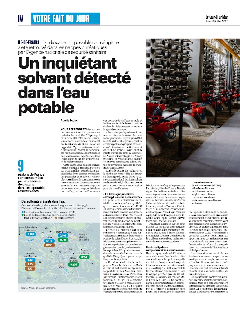 À Saint-Martin-la-Garenne comme à Mareil-sur-Mauldre (Yvelines), l’Agence nationale de sécurité sanitaire (Anses) a détecté la présence de 1,4-dioxane, un solvant potentiellement cancérigène, dans les nappes phréatiques. Ce composé chimique, classé potentiellement cancérigène, dont la présence dans l’eau potable ne fait l’objet d’aucune réglementation en France.