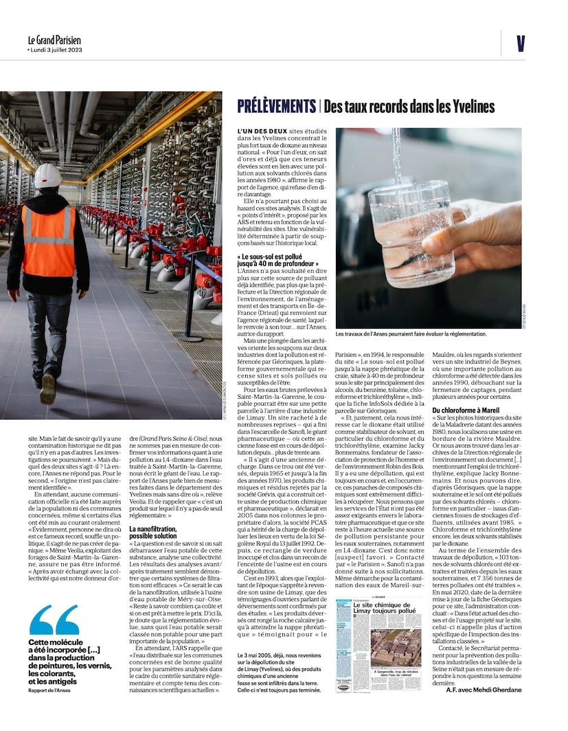 Alors qu’en Allemagne une limite à 0,1 µg/litre a été instaurée, l’Anses a relevé le taux record en France sur l’un des deux sites étudiés dans les Yvelines. « Pour l’un d’eux, on sait d’ores et déjà que ces teneurs élevées sont en lien avec une pollution aux solvants chlorés dans les années 1980 », affirme le rapport de l’agence, qui refuse d’en dire davantage.
