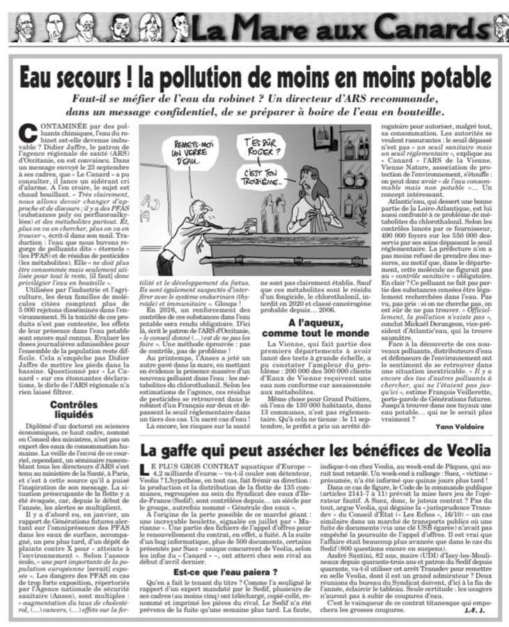 Utilisées par l'industrie et l'agriculture, les deux familles de molécules citées comptent plus de 5 000 rejetons disséminés dans l'environnement. Si la toxicité de ces produits n'est pas contestée, les effets de leur présence dans l'eau potable sont encore mal connus. Evaluer les doses journalières admissibles pour l'ensemble de la population reste difficile. Cela n'empêche pas Didier Jaffre de mettre les pieds dans la bassine. Questionné par « Le Canard » sur ces étonnantes déclarations, le dirlo de l'ARS régionale n'a rien laissé filtrer.
