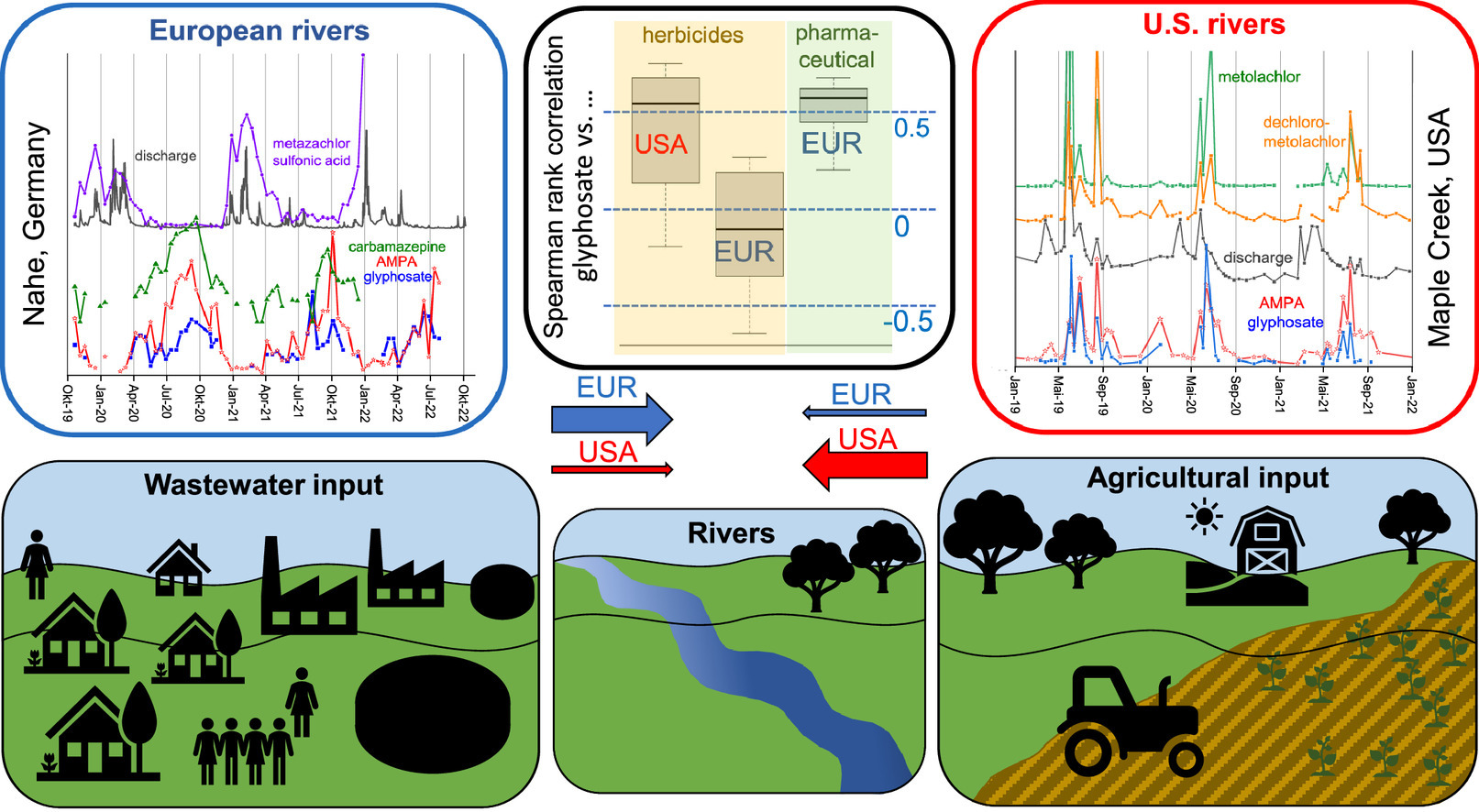 L'herbicide glyphosate le plus utilisé contamine les eaux de surface du monde. Les applications agricoles et urbaines sont discutées comme sources de glyphosate. Pour mieux cerner ces sources, nous avons étudié des séries chronologiques à long terme de concentrations de glyphosate et de son principal produit de transformation, l'acide aminométhylphosphonique (AMPA), dans une vaste méta-analyse d'environ 100 sites aux États-Unis et en Europe. Les données des États-Unis révèlent des impulsions de glyphosate et d'AMPA lorsque le débit de la rivière est élevé, ce qui indique probablement une mobilisation par la pluie après l'application d'herbicides. En revanche, les patrons de concentration européens du glyphosate et de l'AMPA montrent une composante cyclique-saisonnière typique dans leurs patrons de concentration, en corrélation avec les patrons de marqueurs d'eaux usées tels que les produits pharmaceutiques,ce qui concorde avec la détection fréquente de ces composés dans les stations d'épuration. Notre grande méta-analyse montre clairement que pendant plus d'une décennie, les eaux usées municipales étaient une source très importante de glyphosate. De plus, les données sur les eaux fluviales européennes montrent des flux de masse de base de glyphosate assez élevés et constants tout au long de l'année, non attendus de l'application d'herbicides. À partir de notre méta-analyse, nous définissons des critères pour une source de glyphosate, qui a été cachée jusqu'à présent. L'AMPA est connu pour être un produit de transformation non seulement du glyphosate mais aussi des aminopolyphosphonates utilisés comme anti-tartre dans de nombreuses applications. Comme ils sont utilisés dans les détergents à lessive en Europe mais pas aux États-Unis, nous émettons l'hypothèse que le glyphosate pourrait également être un produit de transformation des aminopolyphosphonates.Notre grande méta-analyse montre clairement que pendant plus d'une décennie, les eaux usées municipales étaient une source très importante de glyphosate. De plus, les données sur les eaux fluviales européennes montrent des flux de masse de base de glyphosate assez élevés et constants tout au long de l'année, non attendus de l'application d'herbicides. À partir de notre méta-analyse, nous définissons des critères pour une source de glyphosate, qui a été cachée jusqu'à présent. L'AMPA est connu pour être un produit de transformation non seulement du glyphosate mais aussi des aminopolyphosphonates utilisés comme anti-tartre dans de nombreuses applications. Comme ils sont utilisés dans les détergents à lessive en Europe mais pas aux États-Unis, nous émettons l'hypothèse que le glyphosate pourrait également être un produit de transformation des aminopolyphosphonates.Notre grande méta-analyse montre clairement que pendant plus d'une décennie, les eaux usées municipales étaient une source très importante de glyphosate. De plus, les données sur les eaux fluviales européennes montrent des flux de masse de base de glyphosate assez élevés et constants tout au long de l'année, non attendus de l'application d'herbicides. À partir de notre méta-analyse, nous définissons des critères pour une source de glyphosate, qui a été cachée jusqu'à présent. L'AMPA est connu pour être un produit de transformation non seulement du glyphosate mais aussi des aminopolyphosphonates utilisés comme anti-tartre dans de nombreuses applications. Comme ils sont utilisés dans les détergents à lessive en Europe mais pas aux États-Unis, nous émettons l'hypothèse que le glyphosate pourrait également être un produit de transformation des aminopolyphosphonates.Les données sur les eaux fluviales européennes montrent des flux de masse de base assez élevés et constants de glyphosate tout au long de l'année, non attendus de l'application d'herbicides. À partir de notre méta-analyse, nous définissons des critères pour une source de glyphosate, qui a été cachée jusqu'à présent. L'AMPA est connu pour être un produit de transformation non seulement du glyphosate mais aussi des aminopolyphosphonates utilisés comme anti-tartre dans de nombreuses applications. Comme ils sont utilisés dans les détergents à lessive en Europe mais pas aux États-Unis, nous émettons l'hypothèse que le glyphosate pourrait également être un produit de transformation des aminopolyphosphonates.Les données sur les eaux fluviales européennes montrent des flux de masse de base assez élevés et constants de glyphosate tout au long de l'année, non attendus de l'application d'herbicides. À partir de notre méta-analyse, nous définissons des critères pour une source de glyphosate, qui a été cachée jusqu'à présent. L'AMPA est connu pour être un produit de transformation non seulement du glyphosate mais aussi des aminopolyphosphonates utilisés comme anti-tartre dans de nombreuses applications. Comme ils sont utilisés dans les détergents à lessive en Europe mais pas aux États-Unis, nous émettons l'hypothèse que le glyphosate pourrait également être un produit de transformation des aminopolyphosphonates.L'AMPA est connu pour être un produit de transformation non seulement du glyphosate mais aussi des aminopolyphosphonates utilisés comme anti-tartre dans de nombreuses applications. Comme ils sont utilisés dans les détergents à lessive en Europe mais pas aux États-Unis, nous émettons l'hypothèse que le glyphosate pourrait également être un produit de transformation des aminopolyphosphonates.L'AMPA est connu pour être un produit de transformation non seulement du glyphosate mais aussi des aminopolyphosphonates utilisés comme anti-tartre dans de nombreuses applications. Comme ils sont utilisés dans les détergents à lessive en Europe mais pas aux États-Unis, nous émettons l'hypothèse que le glyphosate pourrait également être un produit de transformation des 