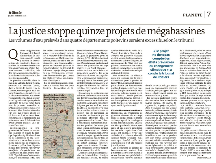 Ces réserves, d’une capacité totale d’environ 3 millions de mètres cubes, devaient être construites en Charente, Charente-Maritime, dans les Deux-Sèvres ainsi qu’en Vienne. Leur principe : prélever de l’eau dans les nappes superficielles en hiver pour la mettre à disposition d’agriculteurs irrigants en été quand la pluie se fait rare. Le tribunal a jugé que ces projets n’étaient « pas associés à de réelles mesures d’économie d’eau » et n’étaient pas adaptés aux effets du changement climatique.